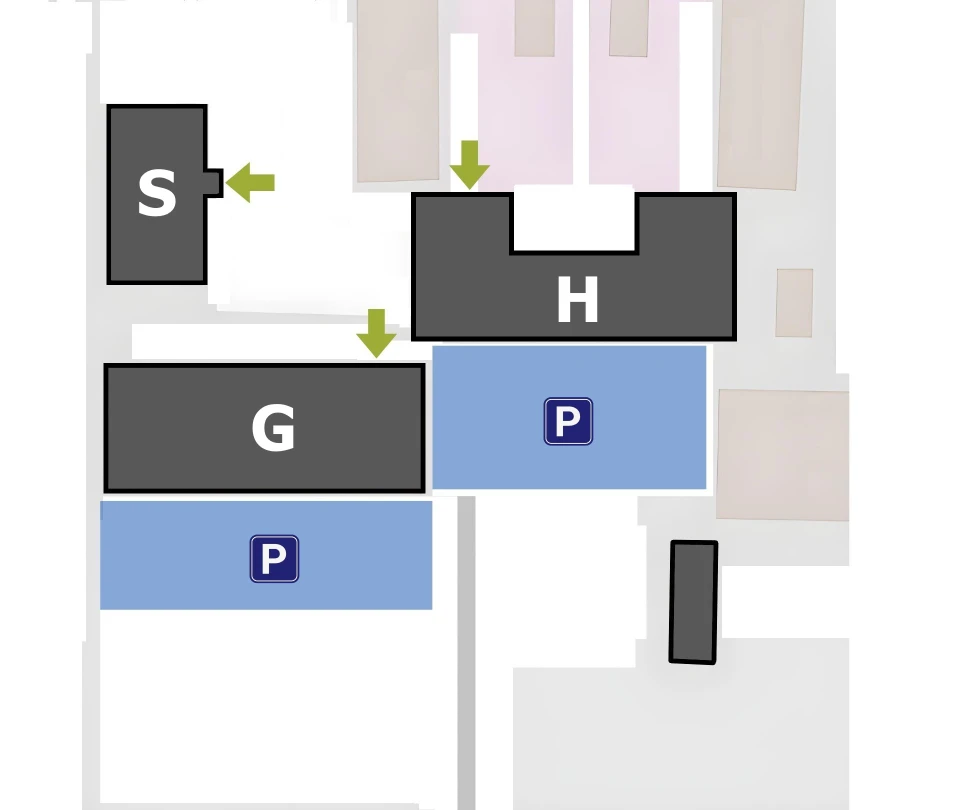 Parkeringsområder er vist med blå P‑symboler, og grønne pile indikerer de primære indgange til bygningerne.