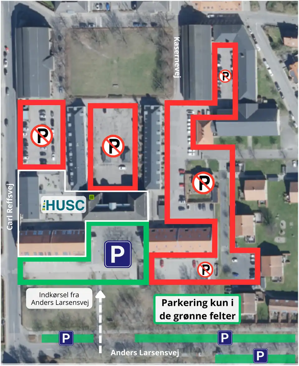 Et oversigtskort markerer, hvor parkering er tilladt og forbudt i området omkring HUSC. De grønne felter angiver de områder, hvor parkering er tilladt, mens de røde felter markerer zoner med parkeringsforbud. Indkørsel sker fra Anders Larsensvej, og alle officielle parkeringspladser er tydeligt markeret med P‑symboler. Teksten “Parkering kun i de grønne felter” understreger, at al parkering skal ske i de markerede grønne områder.